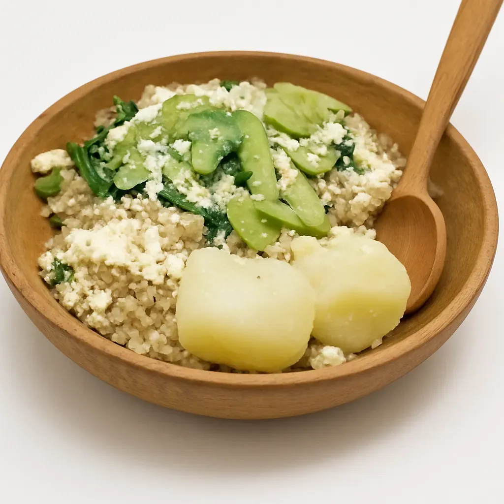 "Phisara de Quinua," a hearty and nutritious dish that combines the earthy taste of quinoa with the freshness of green onions, the creaminess of fresh cheese, and the subtle sweetness of fava beans. This traditional recipe is often accompanied by small, boiled potatoes and a spicy touch of llajwa, a Bolivian hot sauce, making for a rich cultural experience right on your plate.