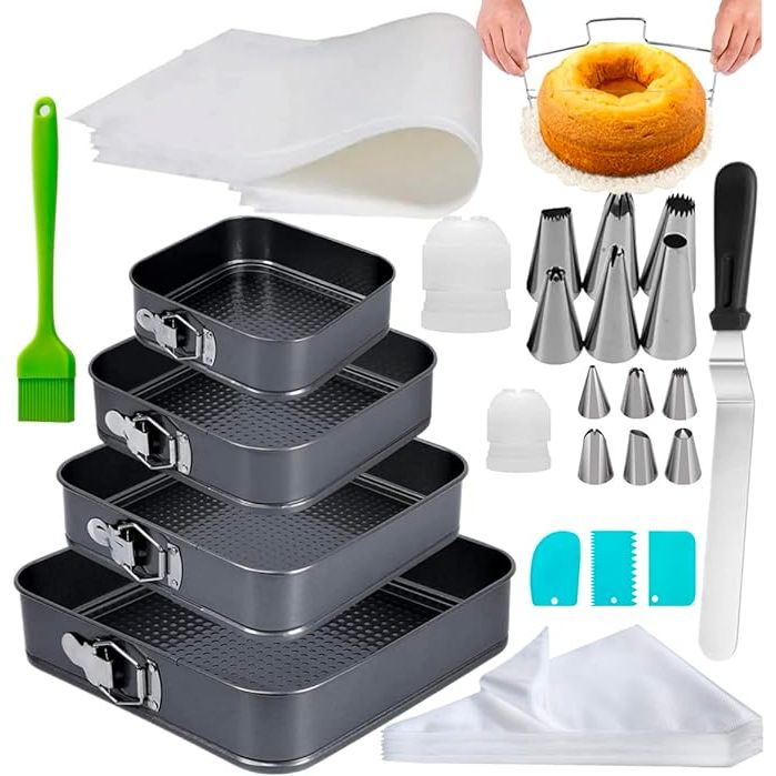 Elevate your baking and cake decorating game with the Cake Square Pan Sets for Baking + Cake Decorating Supplies. This versatile set includes four non-stick springform pans in sizes ranging from 8.5 to 11 inches, allowing for easy release of baked goods without damaging delicate edges. From cakes to cheesecakes, these pans are perfect for a wide variety of baked treats.