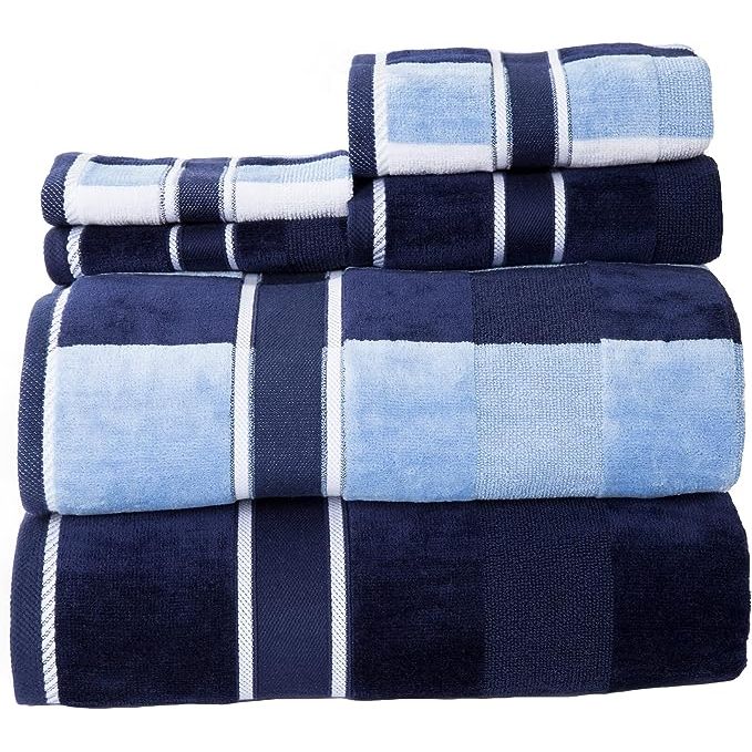 Lavish Home 6-Piece Cotton Towel Set - Navy Bathroom Ensemble with Solid and Striped Bath, Hand, and Washcloths