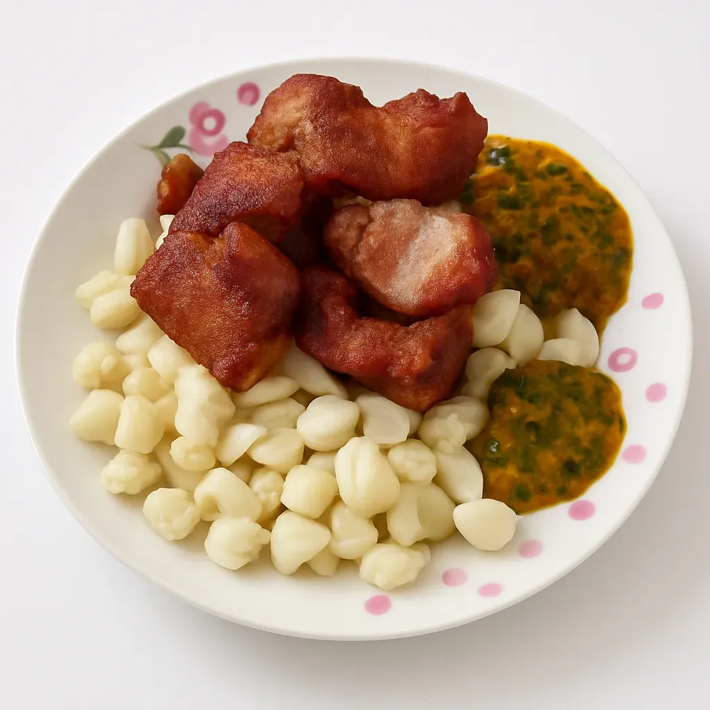 - Arrange fried pork, boiled potatoes, and hominy on a serving plate.
