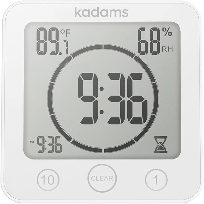 Upgrade your home with the KADAMS Digital Bathroom Shower Kitchen Wall Clock Timer with Alarm. Perfect for wet environments like bathrooms and kitchens, this waterproof clock features a touch screen timer for easy alarm and countdown setting. Not just a timekeeper, it also displays temperature and humidity levels for added convenience.