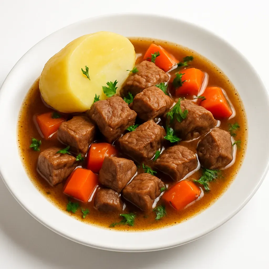 - Serve stew over boiled potatoes, garnish with fresh parsley.