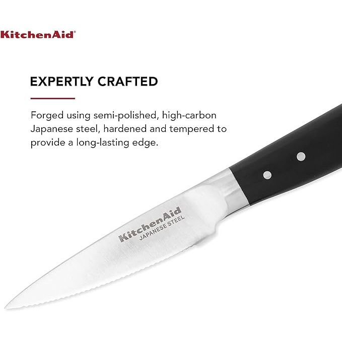 In summary, the KitchenAid Gourmet Forged Triple Rivet Serrated Paring Knife is a reliable companion for everyday cooking tasks. Its sharpness, durability, and ergonomic design make it a valuable addition to any home cook's collection, delivering precision and ease in a compact and efficient package. Experience the quality and convenience of this professional-grade knife in your kitchen today. Description by ChatGPT.