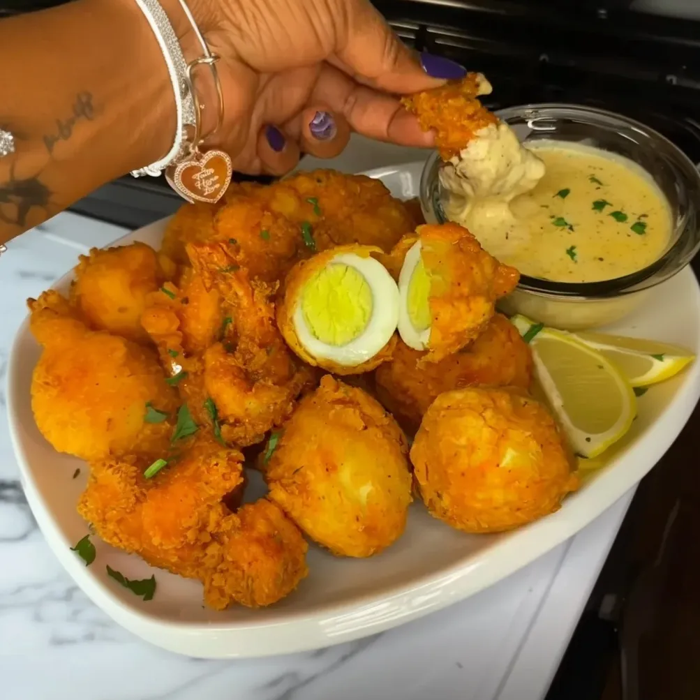 Boiled Fried Eggs and Shrimp is a unique twist on classic fried foods. Hard-boiled eggs and shrimp are coated in a well-seasoned batter, deep-fried to crispy perfection, and served with a creamy dipping sauce. The combination of crispy coating and tender interior makes this dish a must-try snack or appetizer.