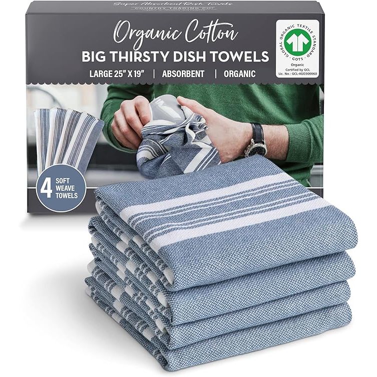 Introducing Country Trading Co.'s Big Thirsty Dish Towels, crafted from 100% organic cotton for a soft touch that's gentle on your skin and the environment. This set of 4 kitchen towels in a stunning blue hue are super absorbent, measuring 25 x 19 each with a soft weave that efficiently soaks up liquids. Perfect for kitchen tasks like drying dishes, wiping countertops, and cleaning spills, these durable towels are designed to last through many uses and machine washes.