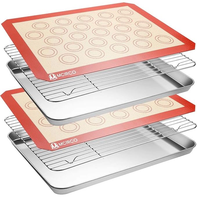 Crafted from premium materials, our baking sheet pans and cooling racks boast high-quality pure stainless steel, offering exceptional resistance to rust and warping. The non-stick silicone baking mats, reinforced with durable fiberglass, can endure temperatures ranging from -40°F to 500°F, making them ideal for a wide range of culinary projects. Their mirror-polished finish reduces the risk of food sticking, while smooth roll rims provide a comfortable grip. The racks feature tight grids and four raised feet, keeping food elevated above juices for perfect results every time.