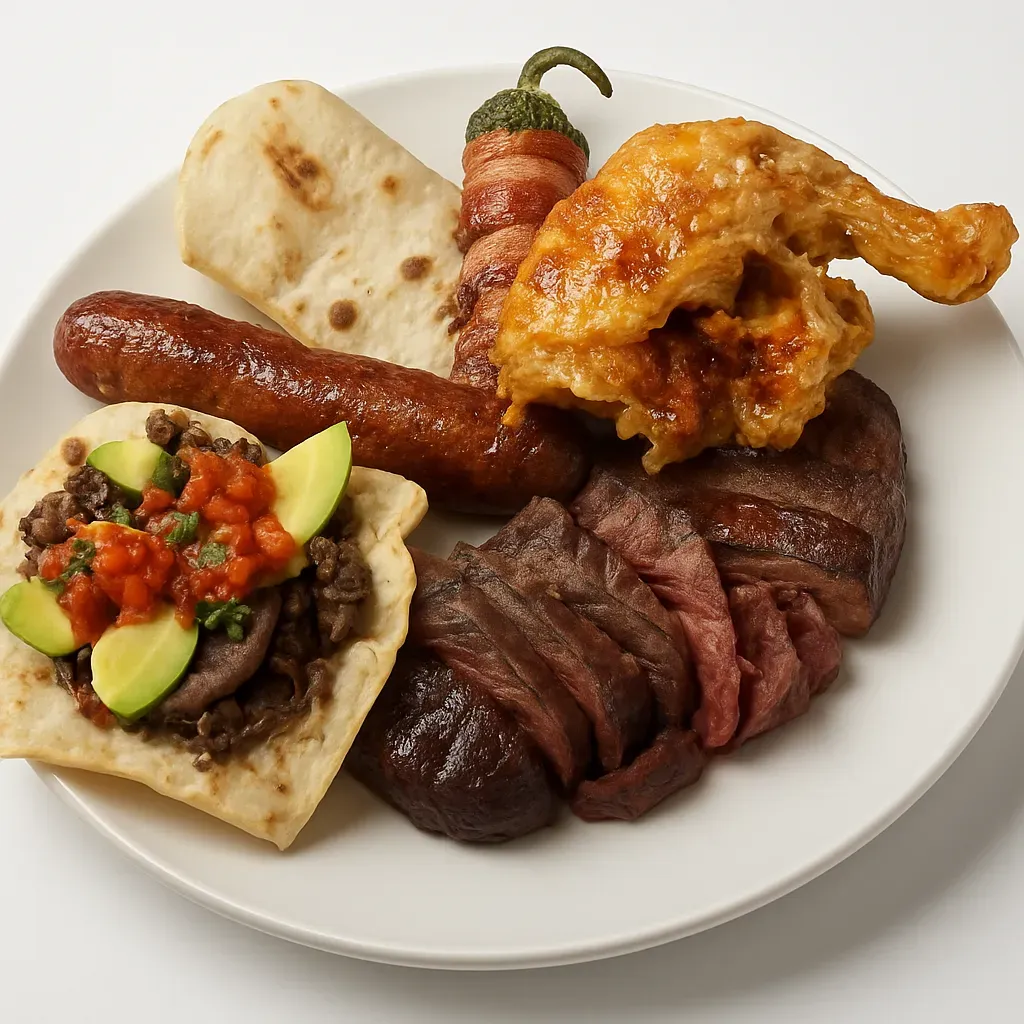 Experience the hearty flavors of Northern Mexico with this vibrant "Parrillada Norteña," a feast of perfectly grilled meats and savory accompaniments. Ideal for sharing with friends and family, this main course is bursting with traditional tastes and irresistible textures.