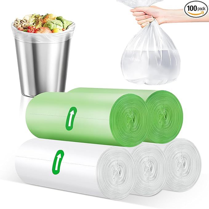 Qunbive Biodegradable 4-Gallon Trash Bags - Leakproof and Sturdy, Unscented Garbage Bags for Office, Kitchen, and Bathroom (White/Green, 100-Pack)