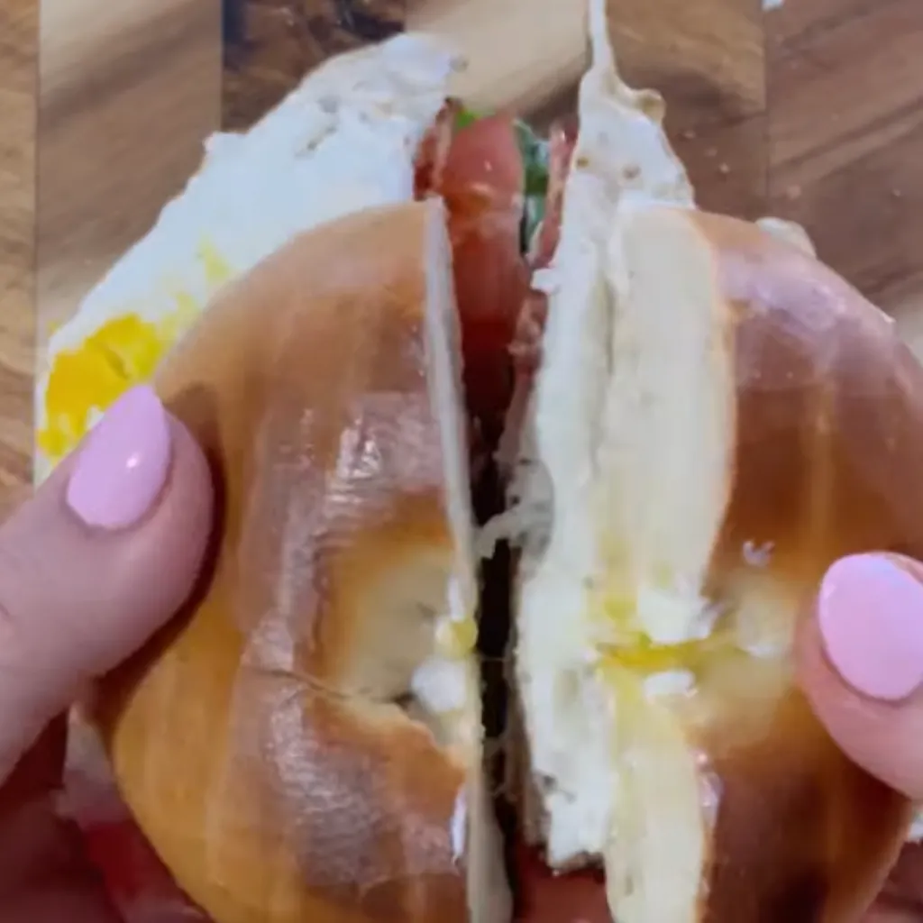 - Cut the assembled bagel in half for easier handling and enjoy warm.