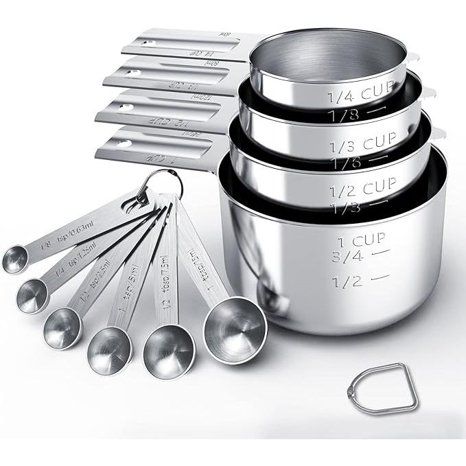 Accurately measure both liquid and dry ingredients with ease using this comprehensive set of measuring cups and spoons. With all the standard measurements included, you can confidently tackle any recipe knowing you have the right tools on hand. Perfect for both beginners and experienced chefs, these measuring tools streamline your cooking and baking tasks, making them more efficient and enjoyable. Invest in quality with the TILUCK Stainless Steel Measuring Cups & Spoons Set for reliable performance in the kitchen. Description by ChatGPT.