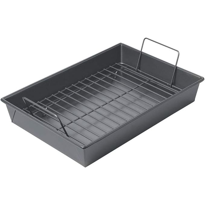 The Chicago Metallic 16947 Professional Roast Pan is a must-have for any kitchen, featuring a 13-inch by 9-inch gray non-stick pan with a convenient rack. With its dual-coated surface, this pan ensures easy food release and hassle-free cleaning every time. The heavy-duty construction of the pan allows for even heat distribution, guaranteeing perfectly cooked roasts and dishes with each use.