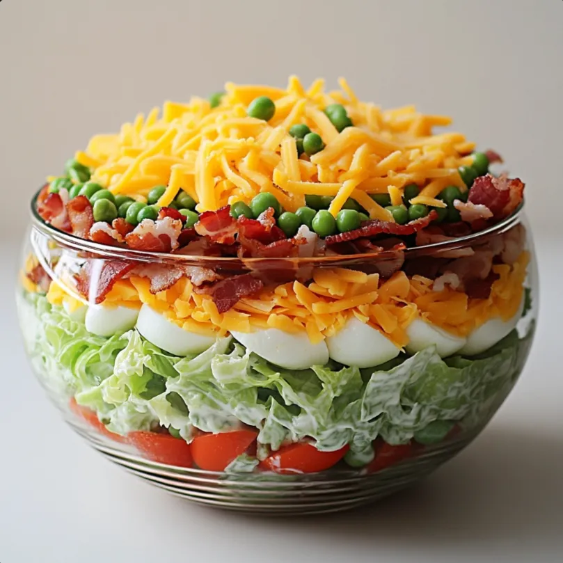 Serve this magnificent Seven-Layer Salad to your guests and enjoy the fresh crunch of lettuce, the creaminess of the dressing, and the delightful mix of savory toppings.