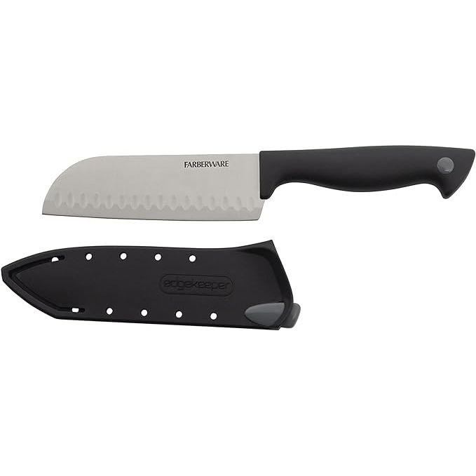 Crafted from high carbon-stainless steel, the Farberware Edgekeeper 5-Inch Santoku Knife boasts a self-sharpening blade cover that keeps its edge sharp with every use. This versatile tool is perfect for slicing, dicing, and mincing various ingredients, ensuring precise cuts every time. The ergonomic handle provides a comfortable grip for effortless kitchen tasks, while the sleek black design adds a touch of sophistication to your culinary space.