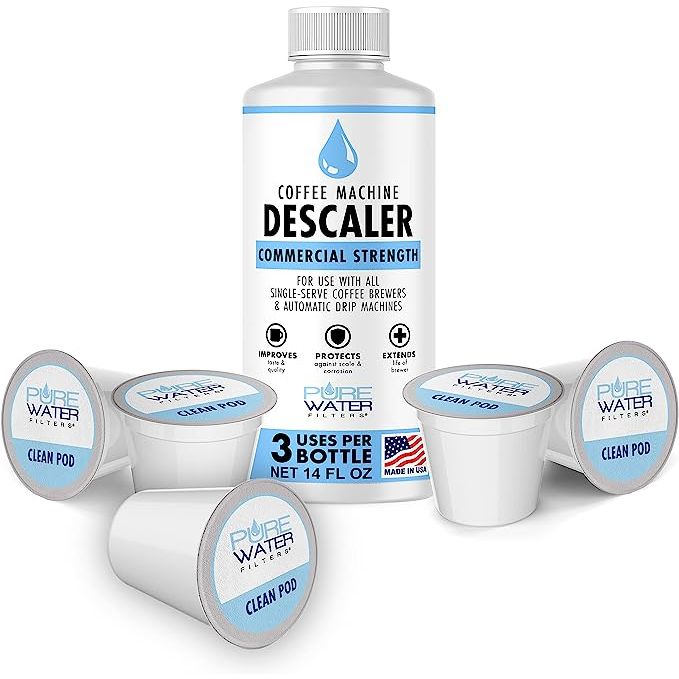 The PureWater Filters Cleaning and Descaler Kit ensures a flawless brewing experience with its 3-use descaler bottle and 5 clean pods, which effectively clean and descale your coffee maker to maintain fresh and flavorful coffee. Descaling is crucial for maintaining the performance of your brewer, and this kit makes it effortless by eliminating mineral buildup and impurities, ultimately extending the lifespan of your Keurig K-Cup Single Serve Brewer.