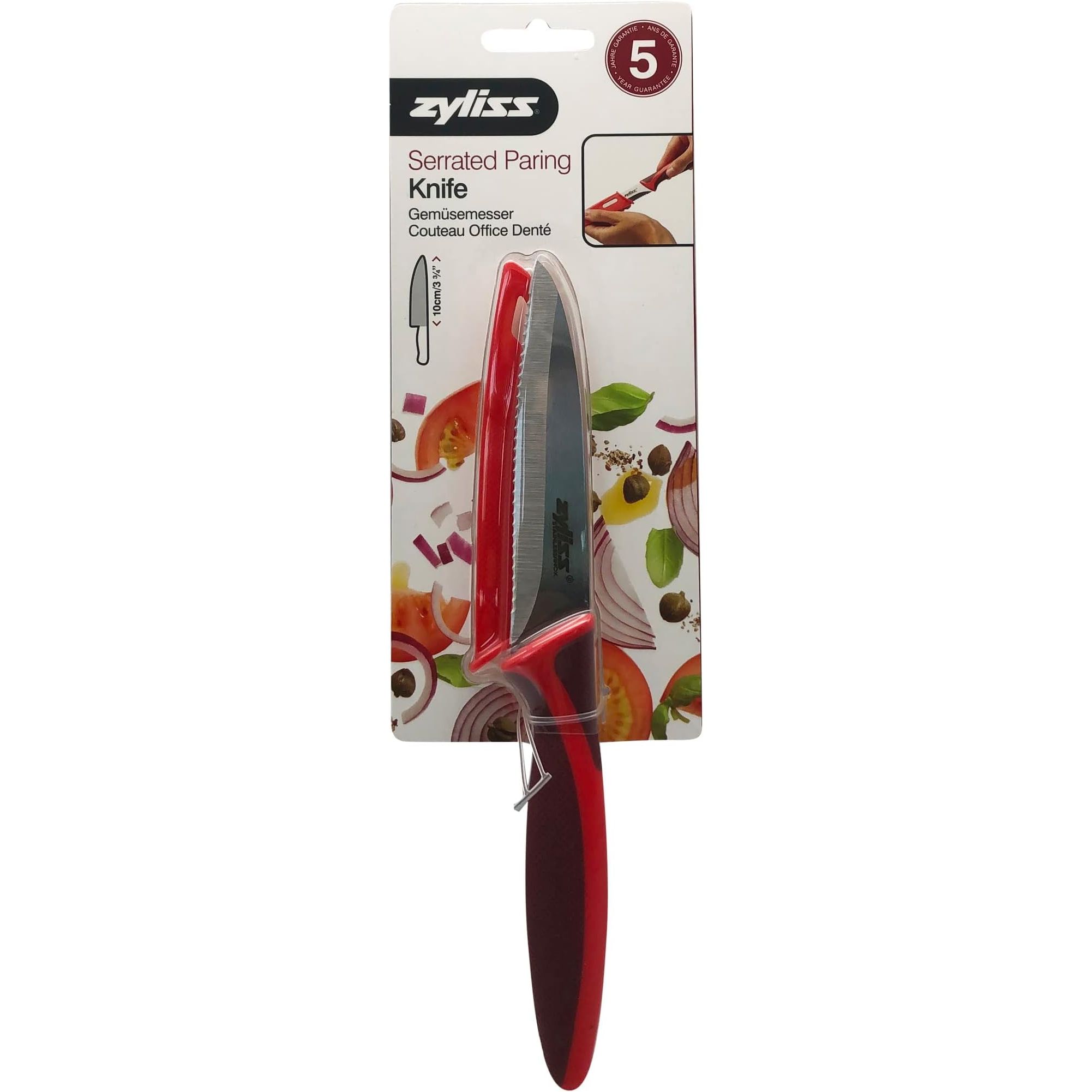 Maximize your kitchen efficiency with the ZYLISS Serrated Paring Knife, featuring a razor-sharp 4-inch stainless steel blade perfect for precision cutting. The serrated edge effortlessly slices through soft fruits and veggies, while the ergonomic handle ensures a comfortable grip during extended use. Its vibrant red color not only adds a splash of brightness to your kitchen but also allows for easy identification in your utensil drawer.