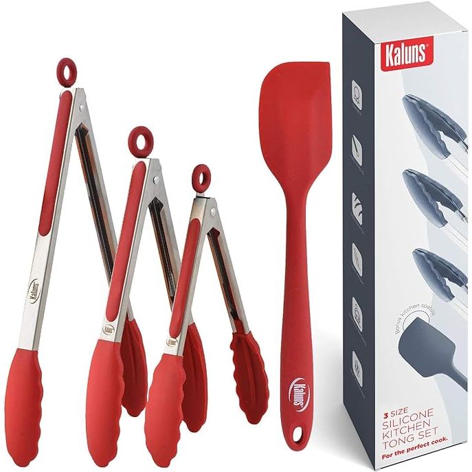 Upgrade your kitchen tools with the Kaluns Tongs set, featuring 7 inch, 9 inch, and 12 inch tongs, along with a bonus silicone spatula. These tongs are available in various colors, adding a touch of elegance to your kitchen decor. The strong pull ring technology and hanging loop ensure easy storage and drying, while the heat-resistant stainless steel construction guarantees no melting or rusting. With a comfortable grip and non-stick silicone edges, these tongs are perfect for confidently lifting heavy foods.