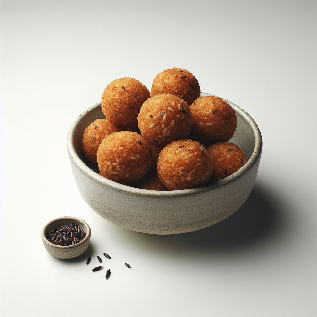 Wild Rice Croquettes, also known as Fried Rice Balls, are a delicious and crispy appetizer perfect for any occasion. These savory bites are made with cooked wild rice mixed with Parmesan cheese, breadcrumbs, and an array of spices and herbs. The wild rice gives these croquettes a nutty flavor and a satisfying chew. Eggs are often used to bind the ingredients together before they are shaped into small balls. These rice croquettes are then rolled in additional breadcrumbs for an extra crispy exterior and deep-fried until golden brown. They can be served with a variety of dipping sauces or as part of a larger meal alongside salad or roasted vegetables. Description by ChatGPT.