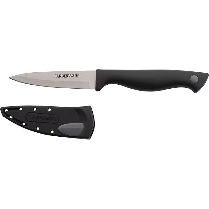 The Farberware Edgekeeper 3.5-Inch Paring Knife is a kitchen essential made from high carbon-stainless steel, known for its durability and sharpness. Its self-sharpening blade cover ensures a razor-sharp edge for effortless cutting and slicing. The ergonomic handle provides comfort and control for any cooking task, while the compact blade is perfect for intricate cutting and peeling.