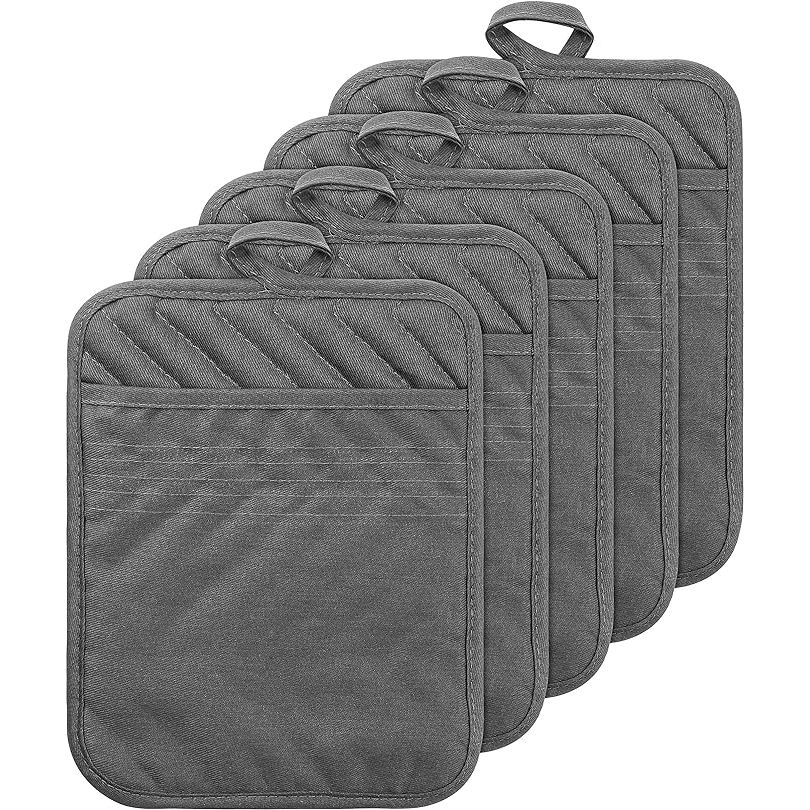 GROBRO7 5-Pack Cotton Pocket Pot Holders - Grey Heat-Resistant Multipurpose Oven Mitts 8.9 x 6.9 Inch
