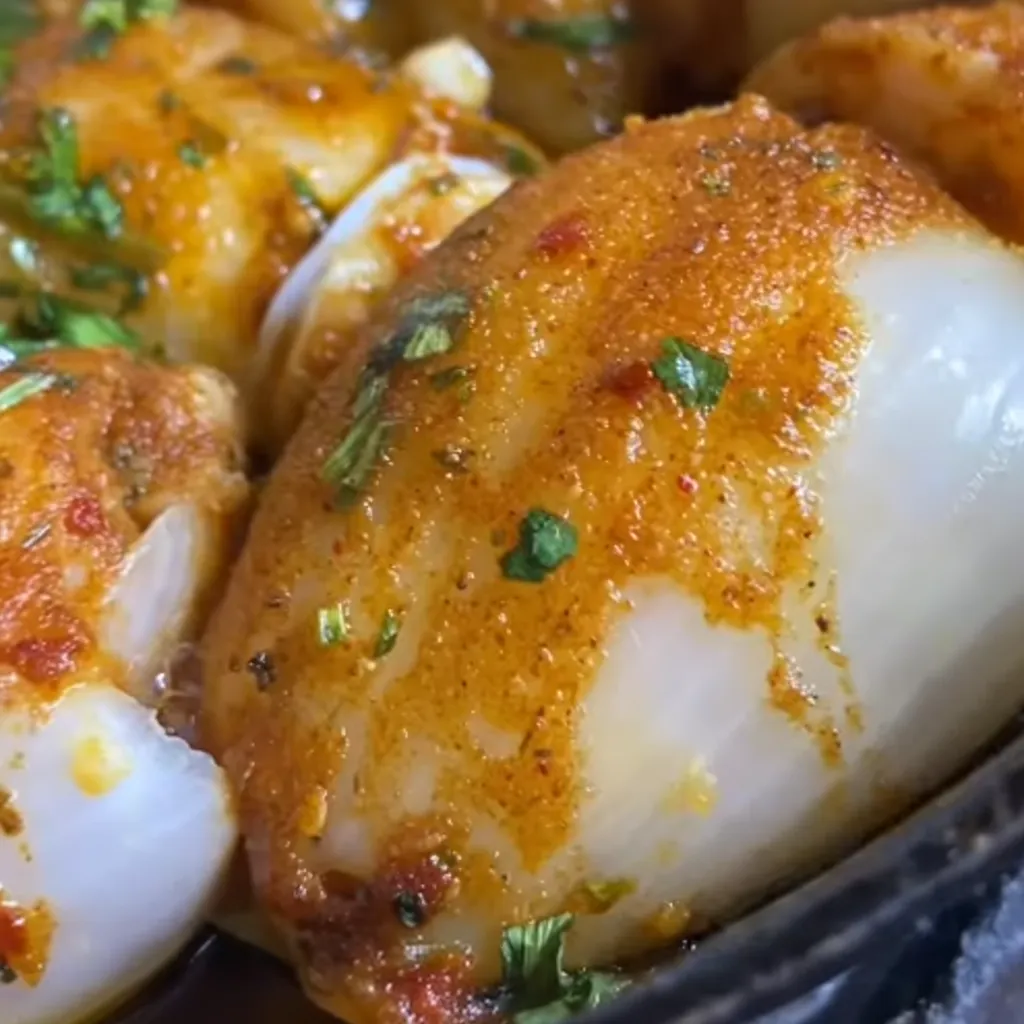 Spicy Stuffed Onions with Potatoes and Shrimp is a flavorful main dish that combines the earthiness of potatoes, the delicate taste of shrimp, and the fiery punch of hot sauce. Large onions are prepped by removing their cores, blanched, and then stuffed with a rich and hearty filling of chopped hard-boiled eggs, mashed potatoes, and seasoned shrimp. Paprika, thyme, and a drizzle of hot sauce add layers of flavor and heat. After being compactly filled, the onions are baked to tender perfection and garnished with fresh parsley for a vibrant finish. This dish is perfect for those who enjoy dynamic and spicy flavors, presenting a unique twist on traditional stuffed onion recipes.