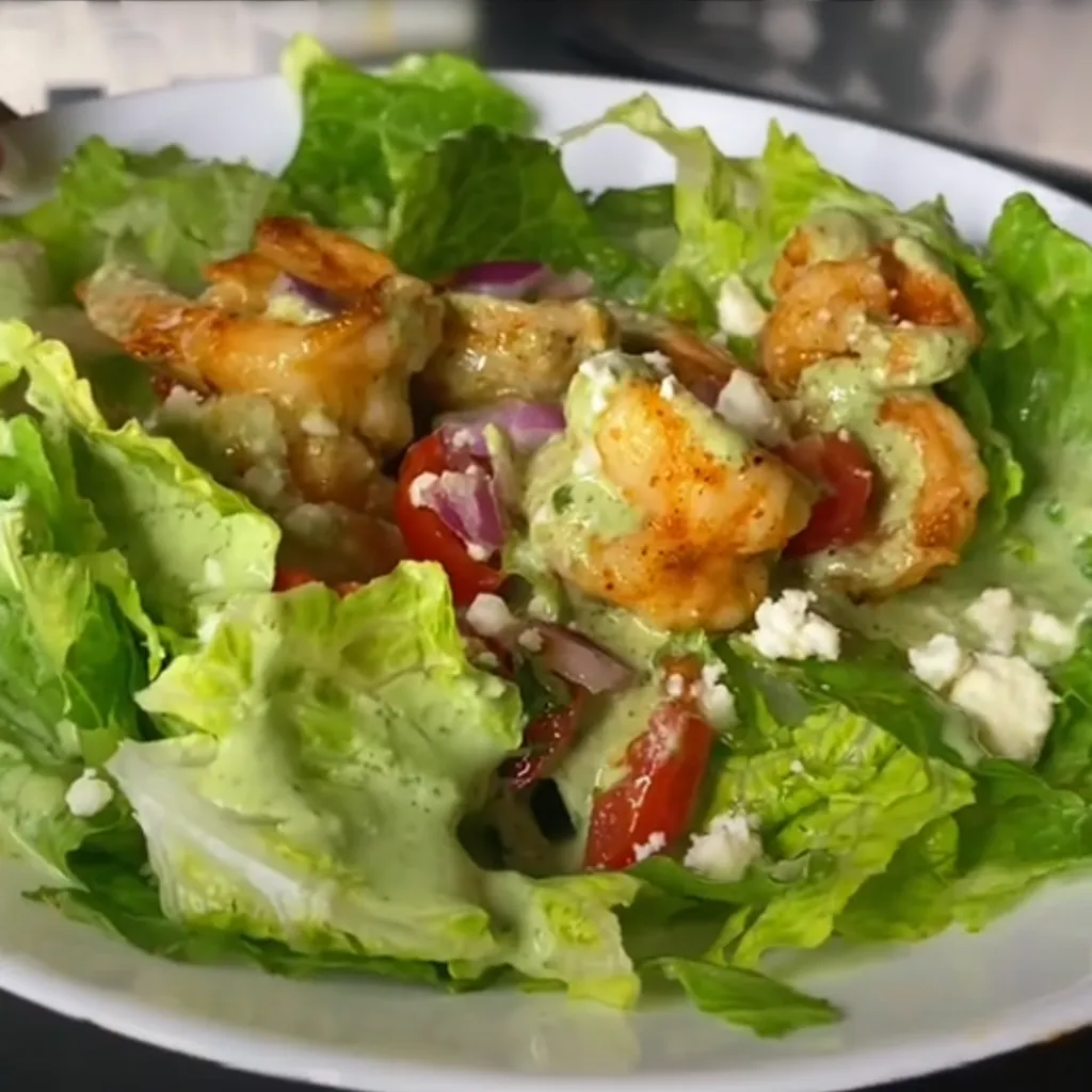 - Drizzle the cilantro lime sauce over the shrimp and lettuce.
