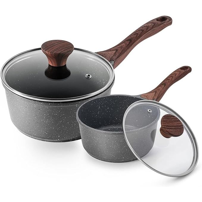 Granite Coated Nonstick Sauce Pan Set, 1.5QT + 2.5QT, with Lid, Stay-cool Handle, Induction Compatible, PFOA Free