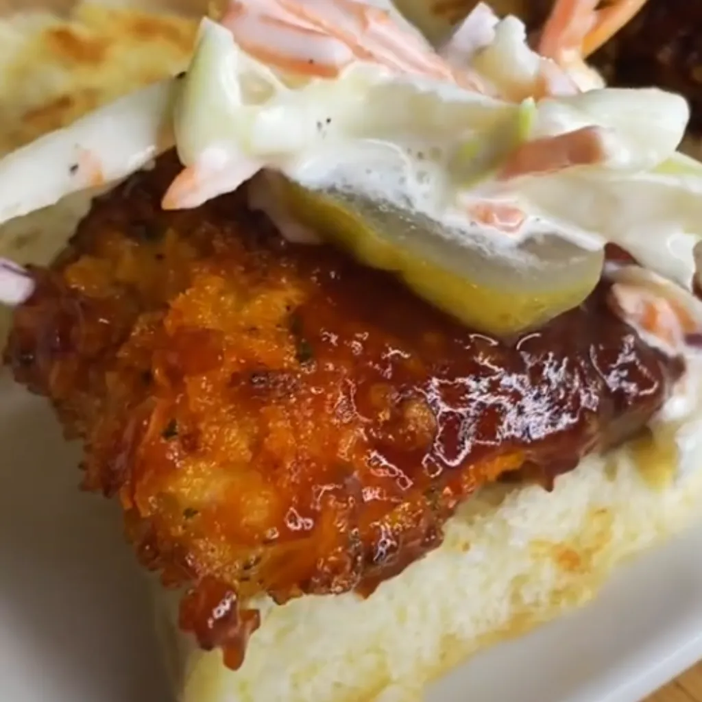 - Place a piece of crispy chicken on the bun, and top with cole slaw and pickles.