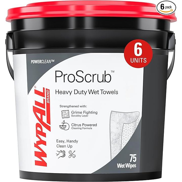 WypAll PowerClean ProScrub Wet Towels, 9.5 x 12, with Bucket, 75 Sheets