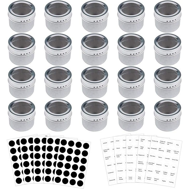Bekith 20 Pack Magnetic Spice Tins Storage Spice Containers, Clear Top Lid with Sift or Pour, Magnetic on Refrigerator and Grill, 240 PVC Spice Label Set