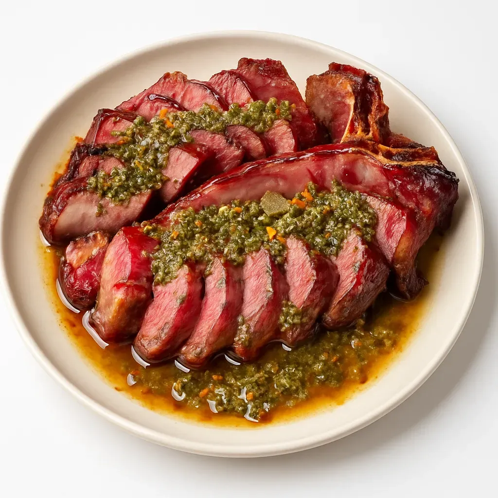 Indulge in the deep, rich flavors of this North American BBQ-style delight featuring a 75-day dry-aged T-bone steak from Alberta. Carefully cooked using the reverse sear method on a Big Green Egg grill, this culinary masterpiece is enhanced with a spicy Al Frugoni Chimichurri, offering a perfect blend of spice and herbaceous notes.
